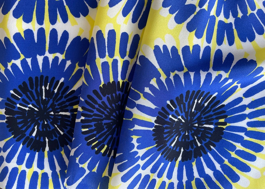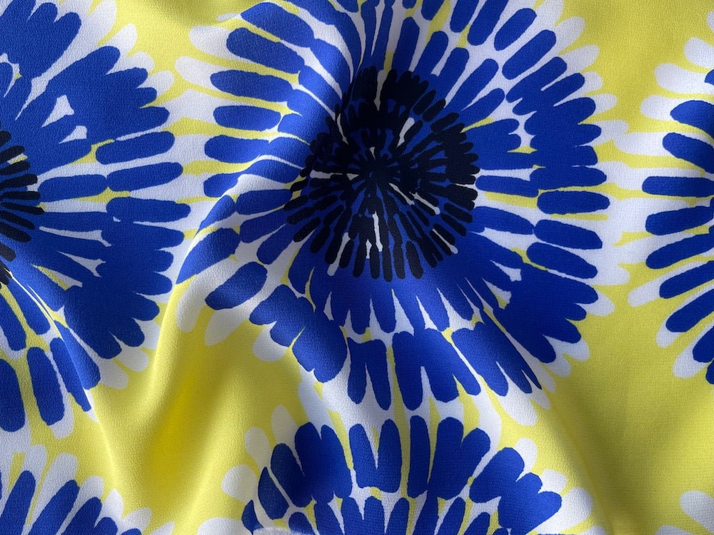 A silk crepe de chine print of cobalt blue sunflowers on a lemon yellow background - this sunny silk is perfect for palazzo pants, a caftan, or a casual over-shirt. Made in Italy and used by Parosh. 100% silk. 53" wide.