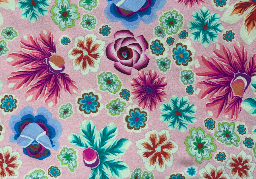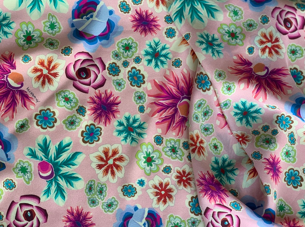 A romantic and charming designer signature silk crepe de chine strewn with Art Deco-influenced blooms on a soft rose background - with shades ranging from teal, to leaf green, to plum this silk is beautiful for anything from a perfect summer dress to a flowing full skirt. Made in Italy. 100% silk. 54" wide.