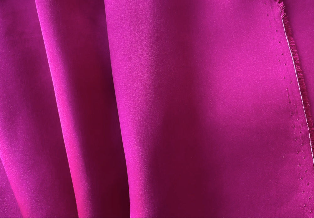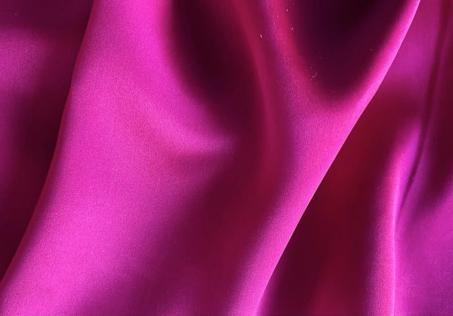 A timeless silk satin charmeuse in saturated tropical fuchsia - this elegant, fluid silk is perfect for a blouse, a dress, lingerie, lining, or a tunic. Made in Italy. 100% silk. 55" wide.