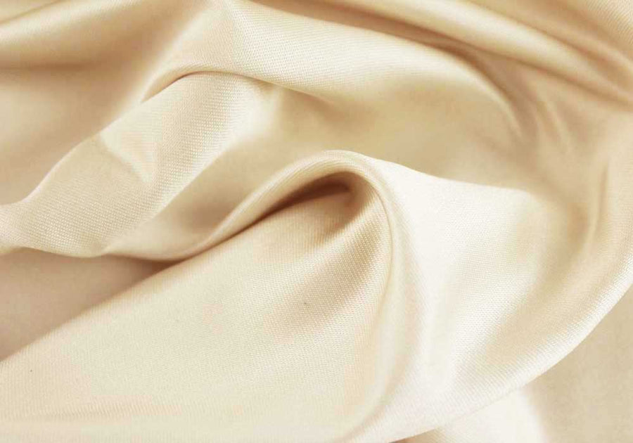 This lustrous silk and rayon duchess satin is a shimmering shade of light ivory, with a rich creamy glow and soft hand. Made in Japan. 65% rayon and 35% silk blend. 48" wide.