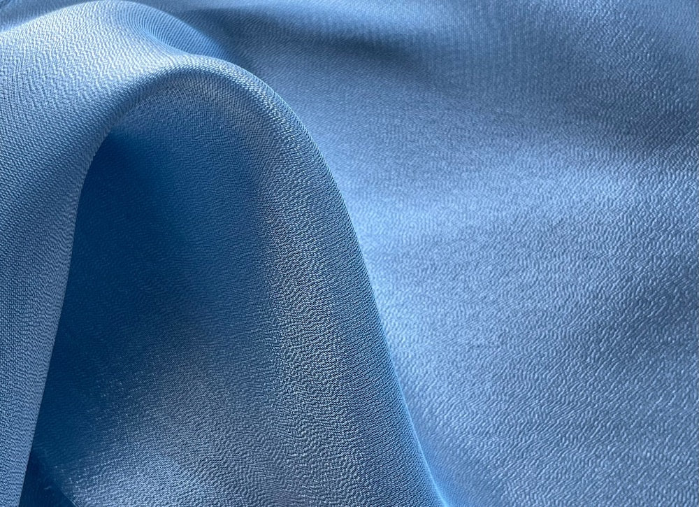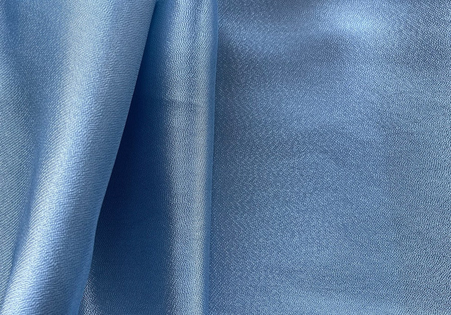 A semi-sheer luxury silk metallic lame in silvery summer sky blue - similar to a crisp organza, this elegant silk is perfect for chic pajama pants, wafty wraps, or tailored sheath dresses. Made in Italy and used by a well-known designer. 50% silk and 50% polyester. 62" wide.