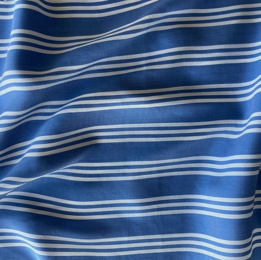 Broadcloth like in texture, this delightful silk crepe de chine has crosswise Yale blue and white stripes - this summery, airy, fluid silk is perfect for blouses, caftans, beach robes, or wide-legged pants. Made in Italy. 100% silk. 58" wide.