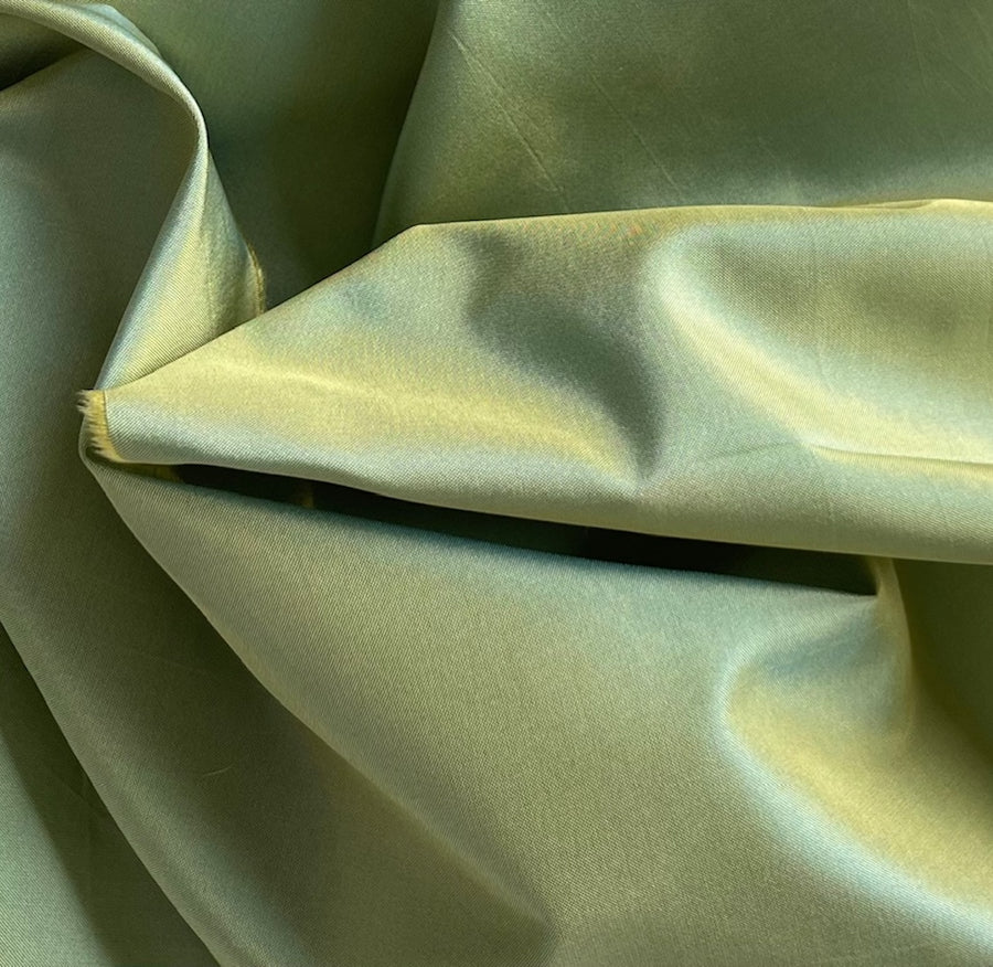 An iridescent, crisp silk taffeta in turquoise shot with lemon - this elegant silk reads as celadon and is stunning for dresses, blouses, slim slacks, or pillows. Made in India. 100% silk. 54" wide.