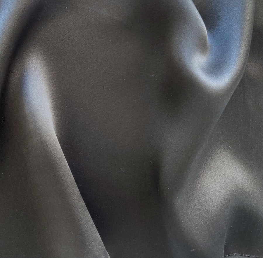 A light-weight gleaming sueded silk satin charmeuse in smokey gunmetal grey - this fluid silk charmeuse has liquid drape and is perfect for blouses, lingerie, wrap tops, anything bias-cut, or lining. 100% silk. 45" wide.