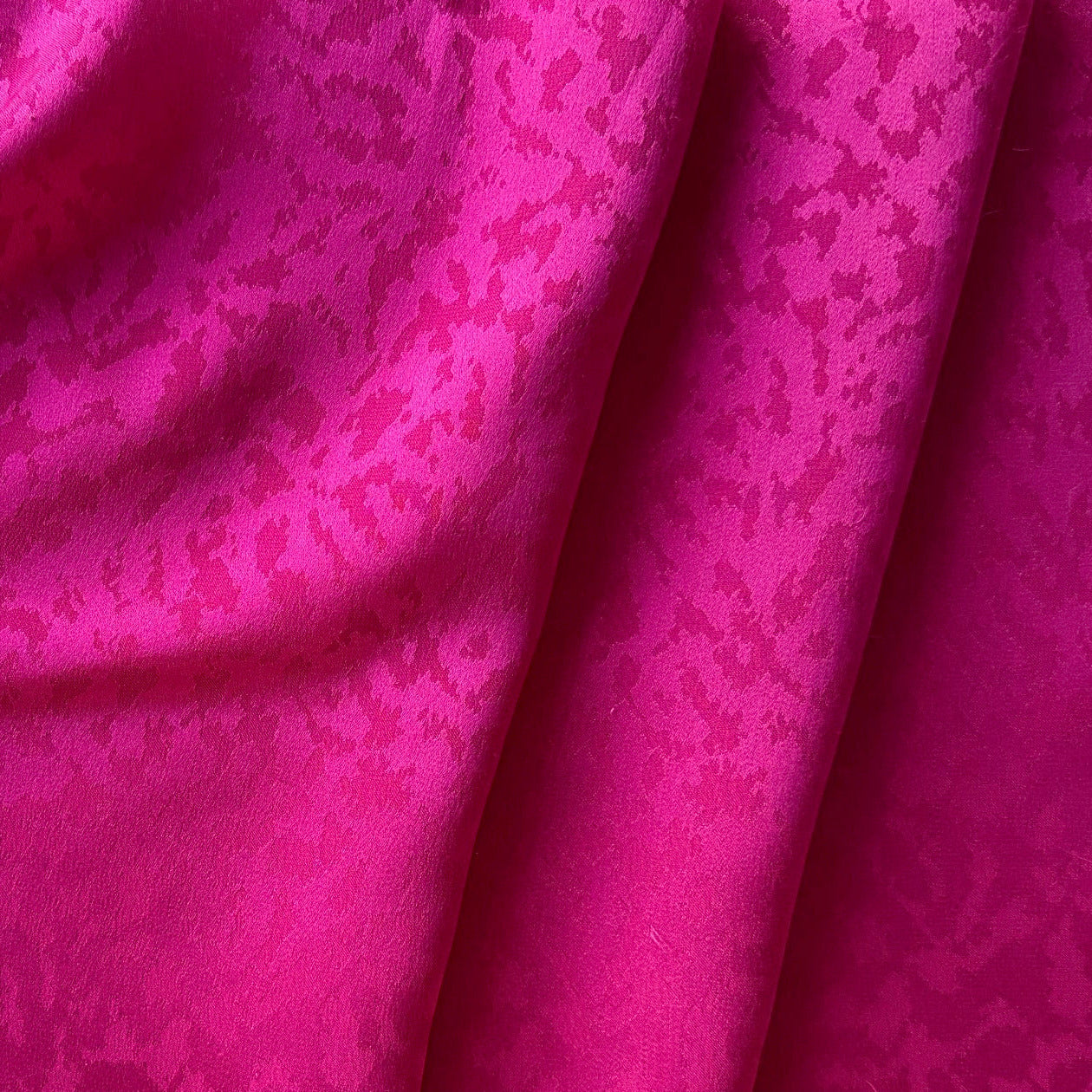 A silk jacquard charmeuse in an abstracted design in shades of magenta flame - this gorgeous, airy silk jacquard charmeuse is perfect for blouses, lingerie, scarves, or dresses. Made in France. 100% silk. 54" wide.