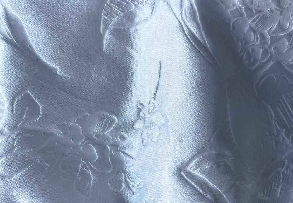An exquisite silk blend jacquard mock organza in a white - this light, airy special occasion silk is opaque, holds its shape and is perfect for a long lean silhouette as well as a full skirt, shaped dress, coat, or a wrap. Made in Italy. 50% silk, 39% acrylic, and 11% polyester. 58" wide.