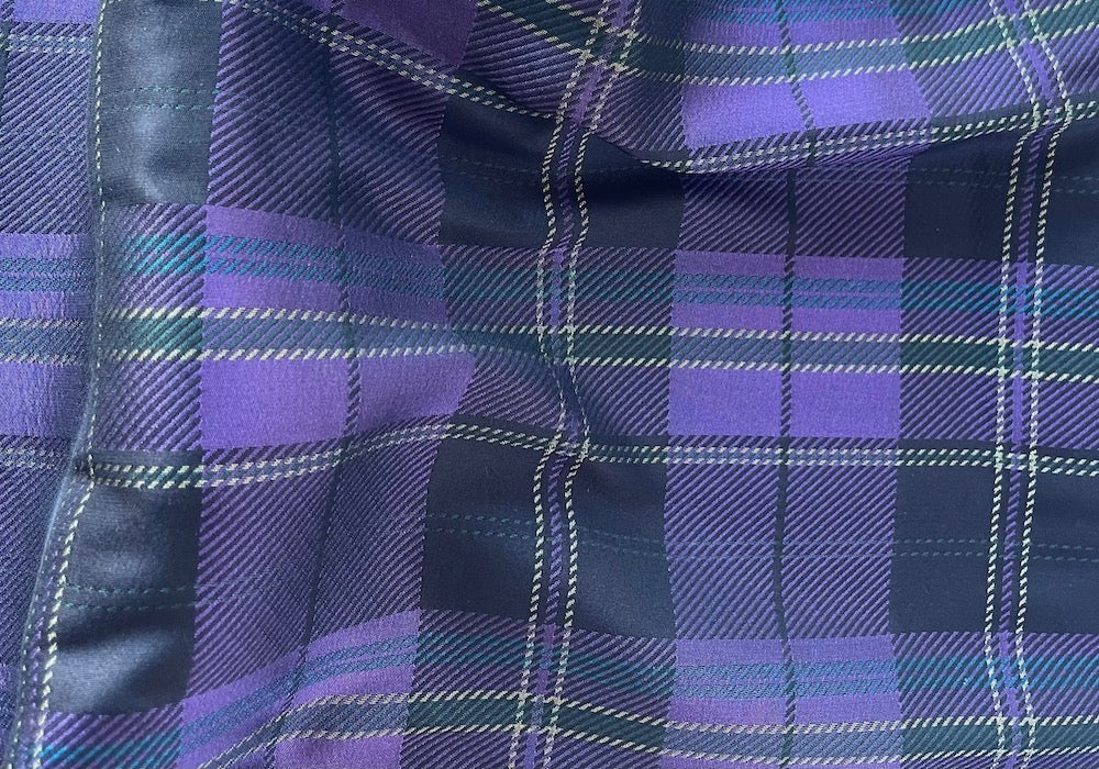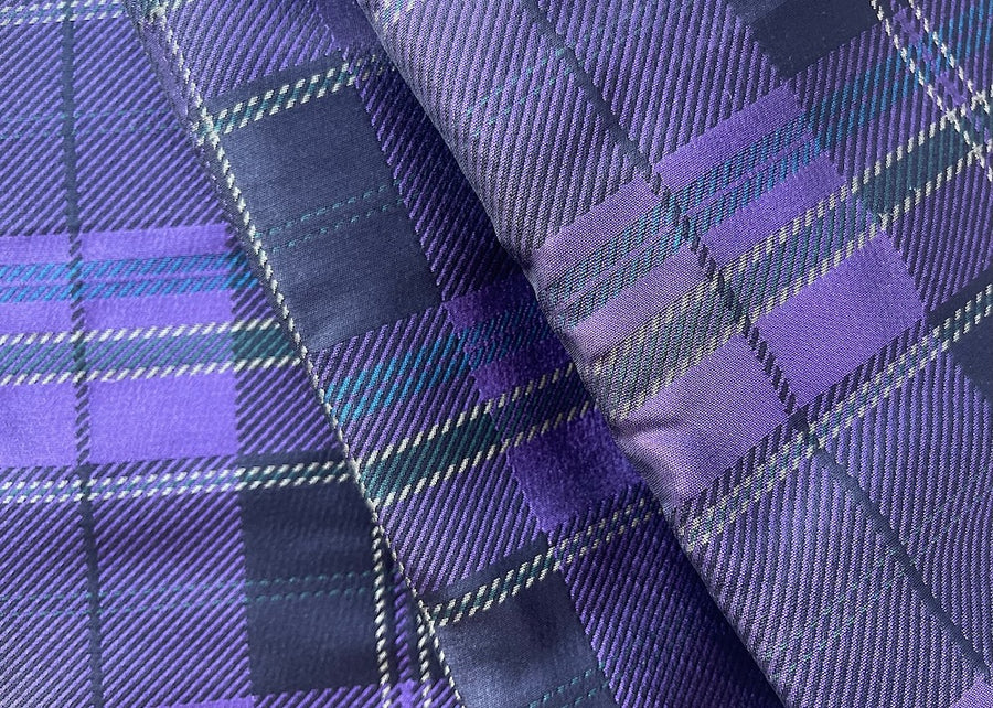A high-end, mid-weight silk blend brocade jacquard in a handsome amethyst plaid, accented with subtle touches of black, teal blue, and pale gold - this elegant brocade is perfect for an au couture jacket or evening pants. Made in Italy. Silk and polyester. 57" wide.