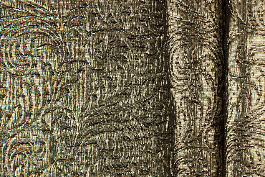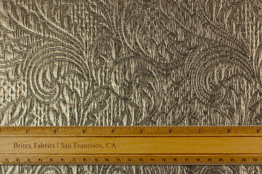 A metallic antique gold and black brocade matelassé in a graceful Arabesque pattern - absolutely perfect for a cocktail sheath dress or an evening wrap! Made in Switzerland. 45% Acetate, 22% wool, and 22% polyester blend. 60" wide.