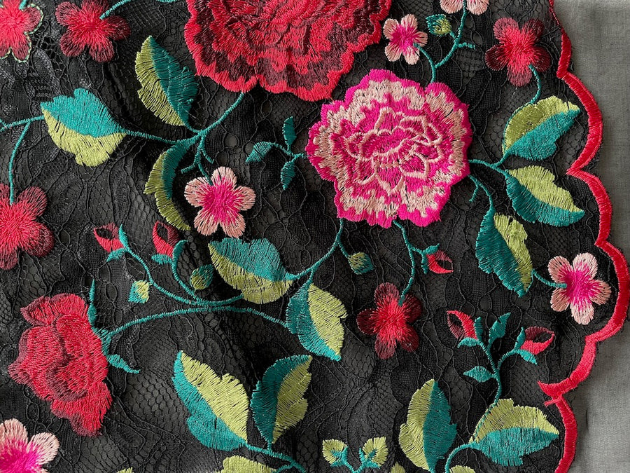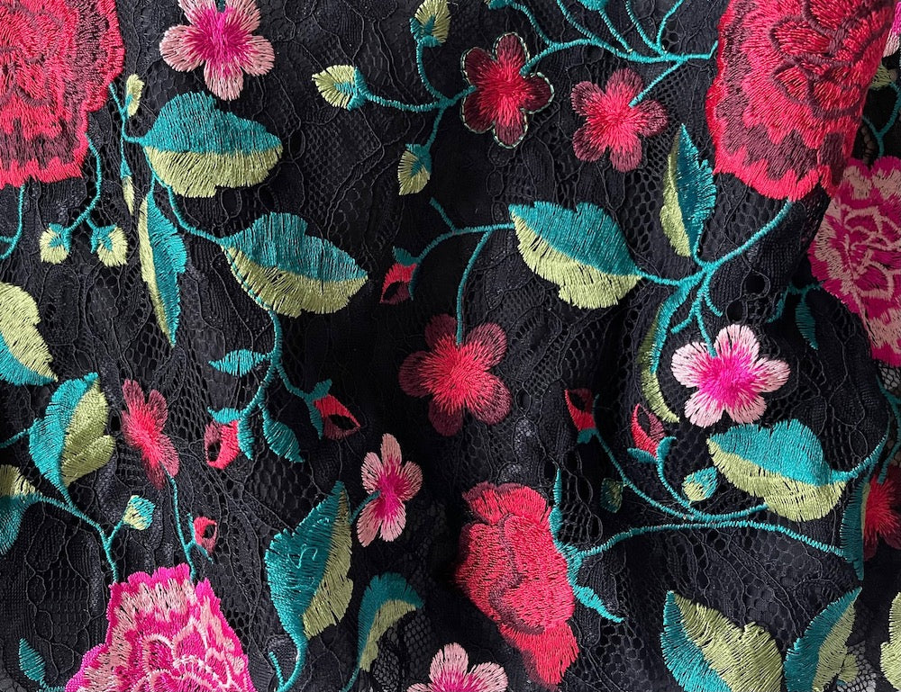 A luxury black Chantilly lace embroidered with gloriously passionate blossoms in shades of carmine and pink - with scalloped edges along each selvedge, this stunning lace fabric is a pure delight and would be fabulous for special occasion dresses and tops. Made in Italy and from well known house of fashion. Poliamide and viscose. 45" wide.