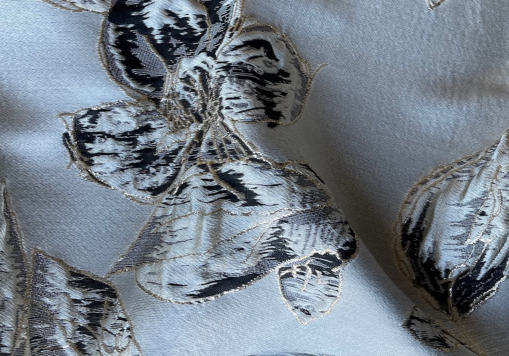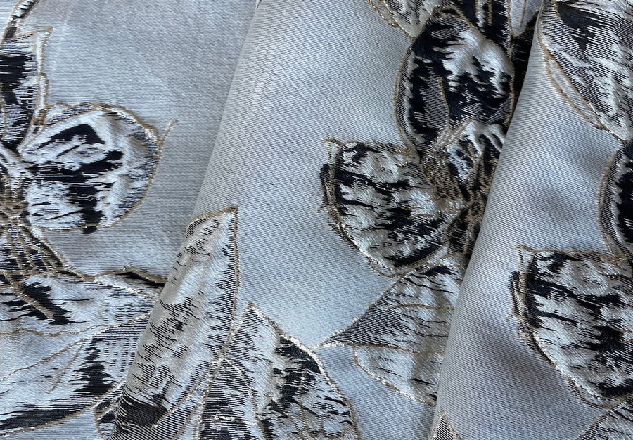 An elegant polyester brocade in pale gold, platinum, and black larger-scale floral design on a platinum background - fabulous for a wrap, costumes, or any other special occasion. 100% polyester. 57" wide.
