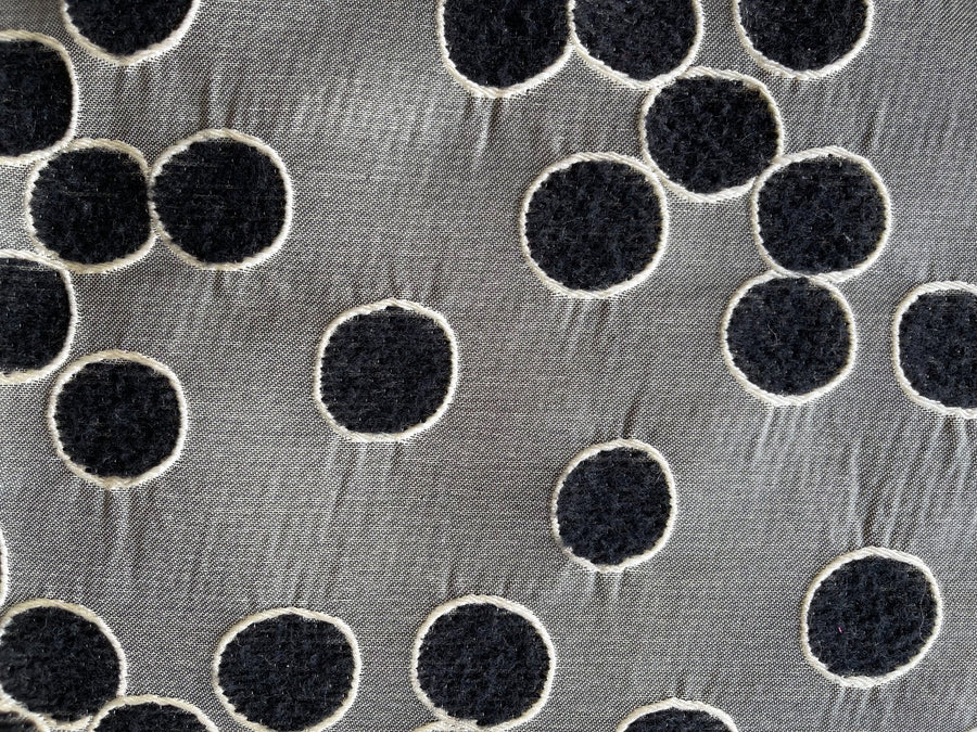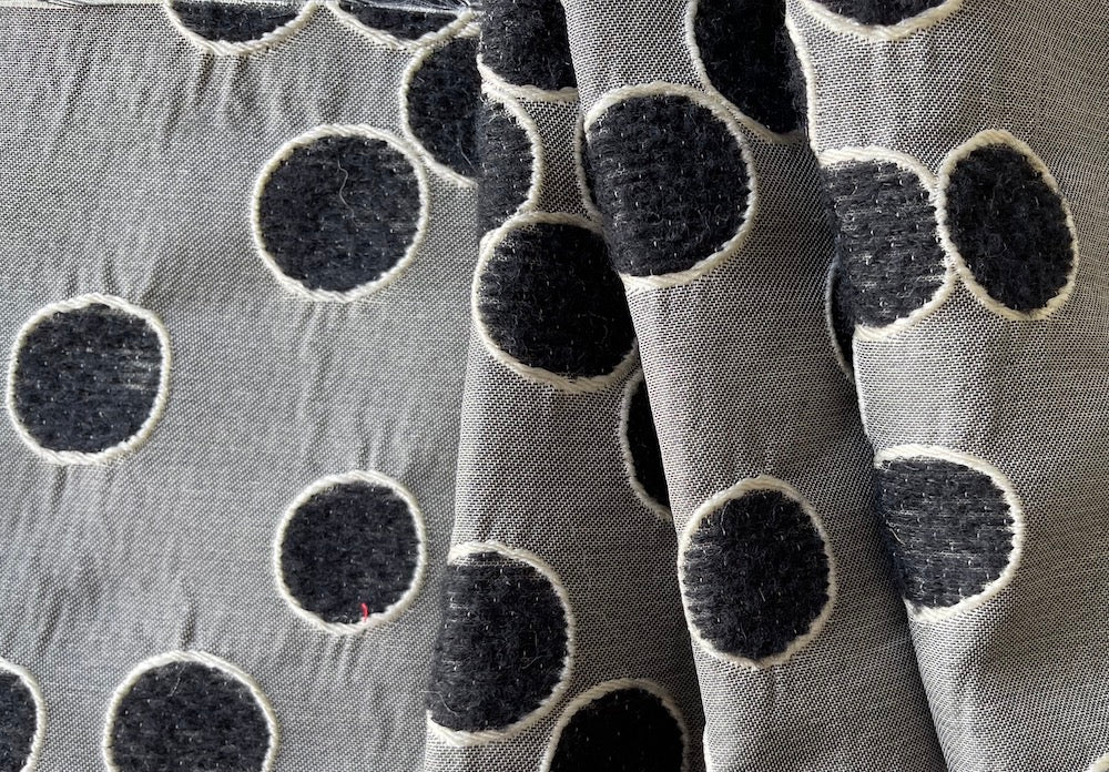 A mid-weight, contemporary brocade in a pattern of embroidered 1" black boba bubbles on a pewter background - with fuzzy bubbles and a dotted flannel reverse, this brocade is perfect for a cropped jacket or a coat. Made in Italy. 80% polyester and 20% wool blend. 58" wide.