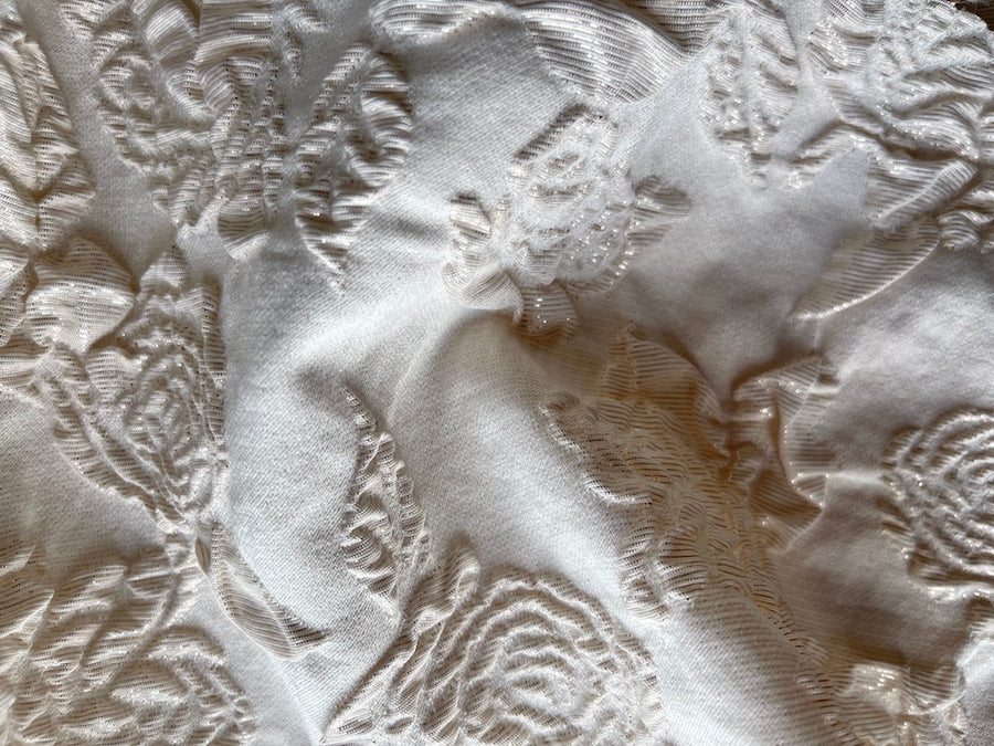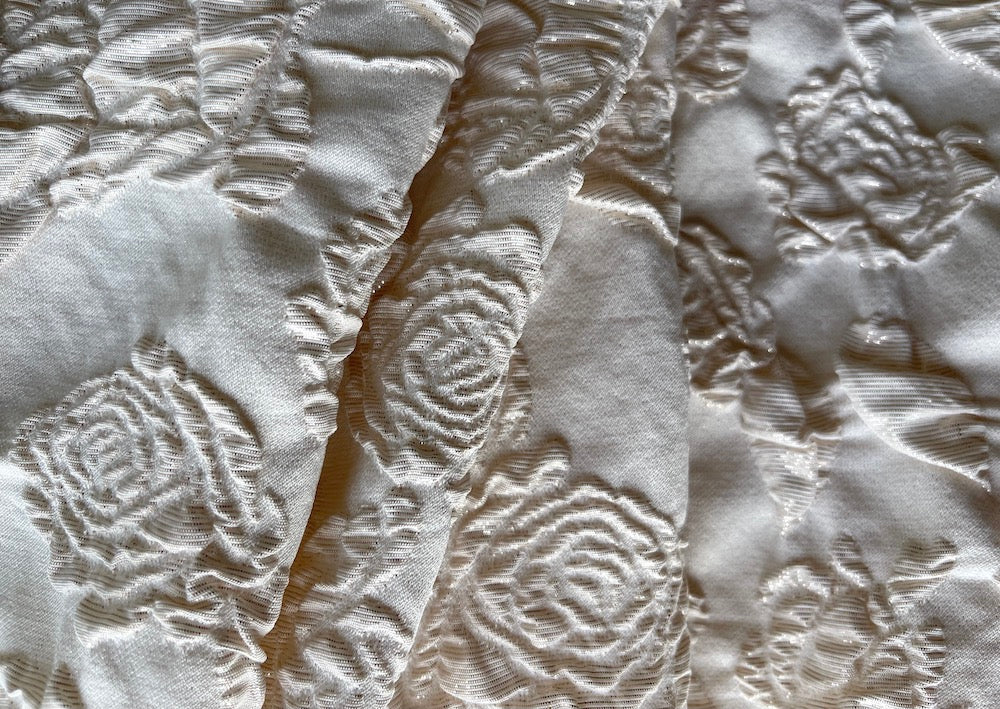 A stretch polyester blend brocade of raised gold dusted rose blooms in pale ivory - with a touch of lycra and metallic gold touches, this brocade is perfect wonderful for a wrap, a fitted sheath dress or a light-weight coat. Polyester, acrylic, and lycra blend. 51" wide.