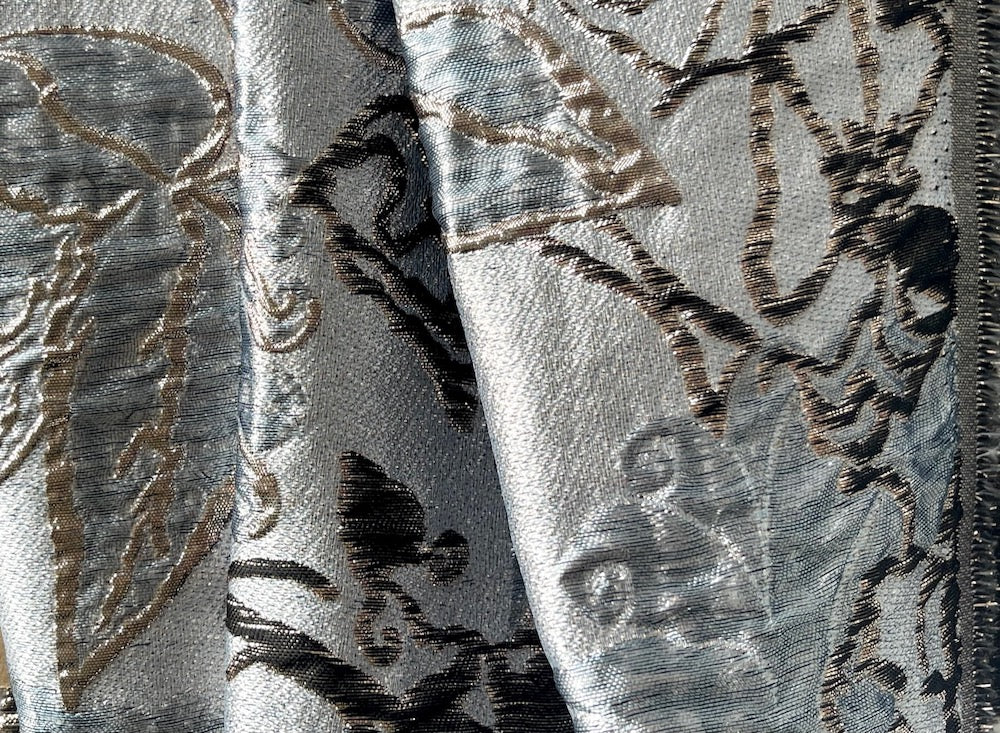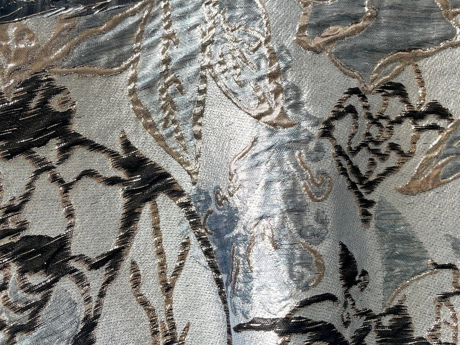 A light-weight, metallic polyester blend brocade in a baroque floral design in shades of gloriously pale gold, iced powder blue, and cool black on a silvery pearl metallic background - this stunning brocade would be fabulous for special occasion dresses, an evening coat, hostess skirts, or an elegant pantsuit. Made in Italy. Polyester and acrylic. 62" wide.
