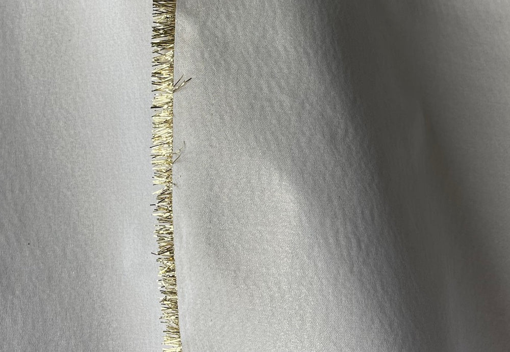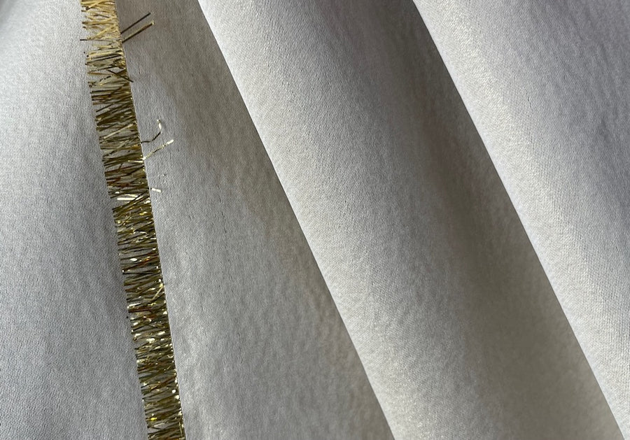 A double-faced, mid-weight metallic polyester brocade in subtle golden ivory glimmer - this shapable brocade is reminiscent of duchess satin and would be fabulous for a sheath dress, wrap coat, hostess skirt, or cigarette pants. Polyester and gold metallic acrylic. 62" wide.