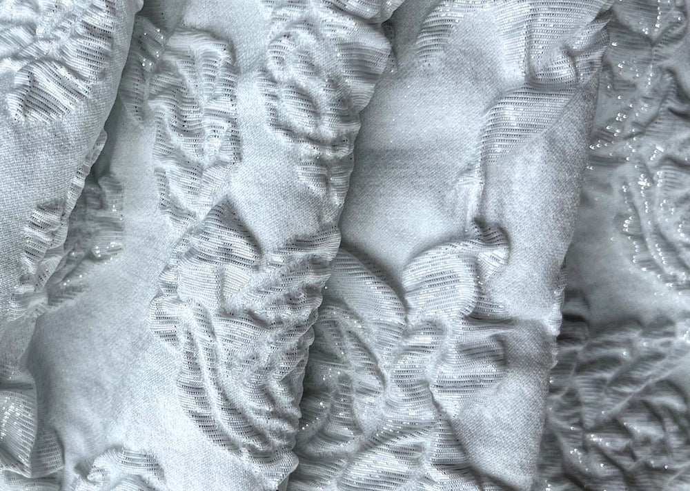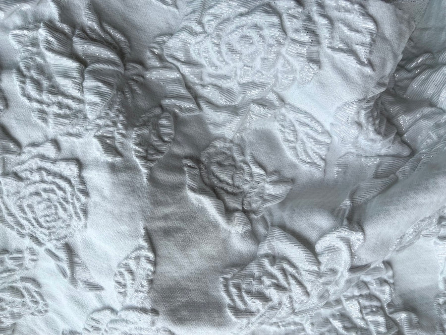 A stretch polyester blend brocade of raised silver dusted rose blooms in white - with a touch of lycra and metallic silver touches, this romantic brocade is perfect wonderful for a wrap, a fitted sheath dress, or a light-weight coat. Polyester, acrylic, and lycra blend. 52" wide.