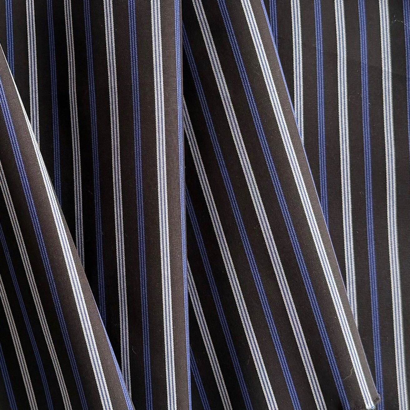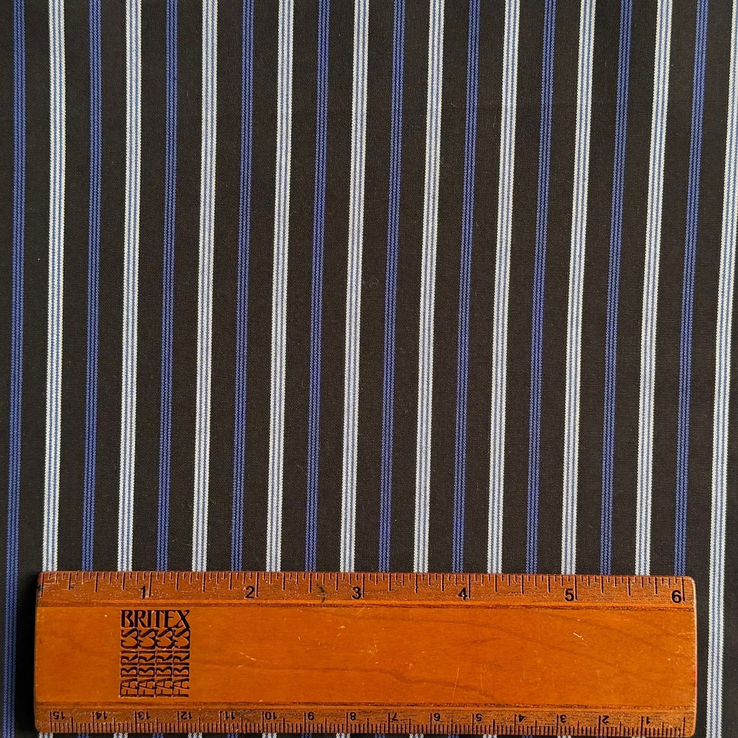 A mid-weight cotton poplin shirting in lengthwise narrow royal blue and white stripes on a jet black background - this cotton shirting is perfect for a blouse, nightwear, or a shirt. Made in Japan. 100% cotton. 60" wide.