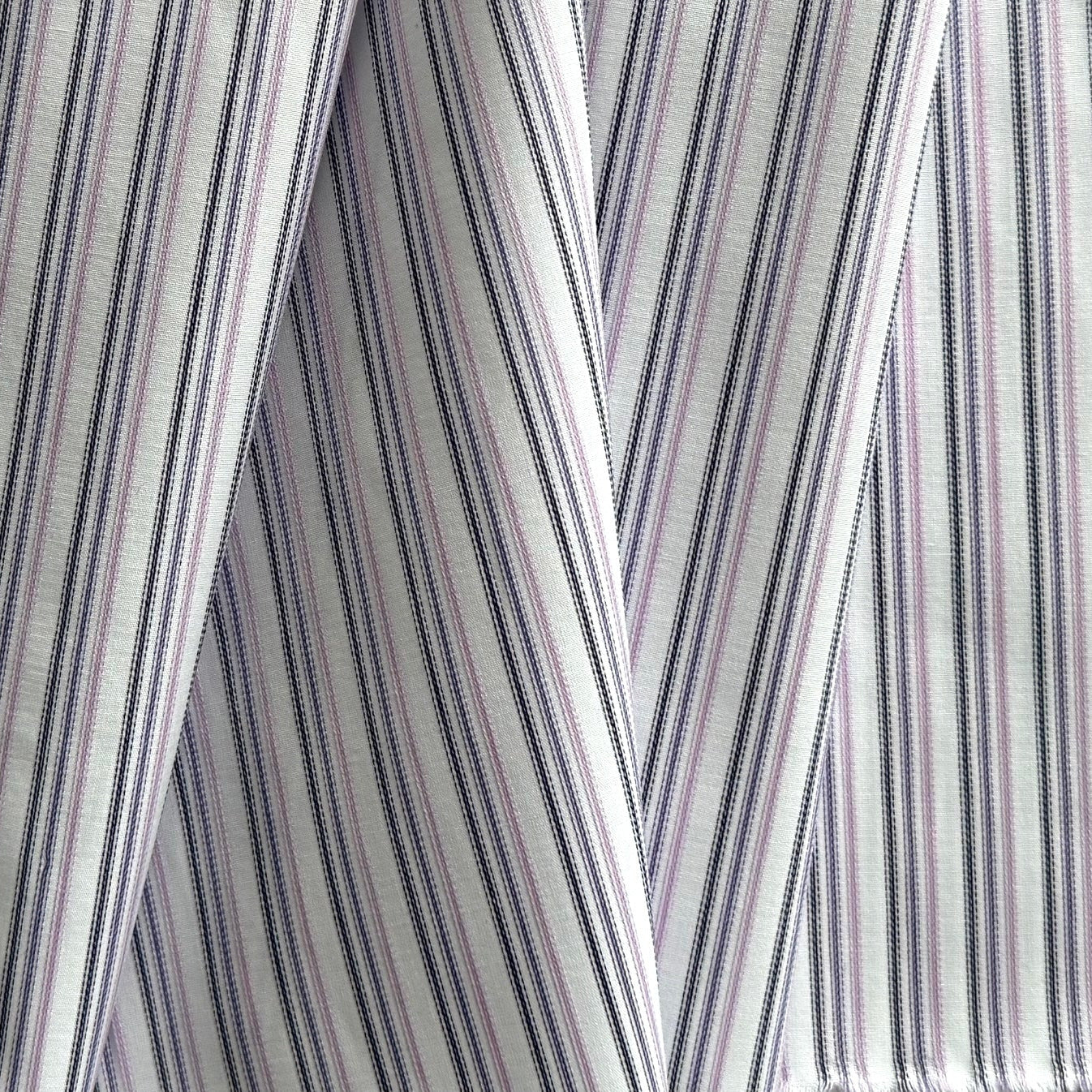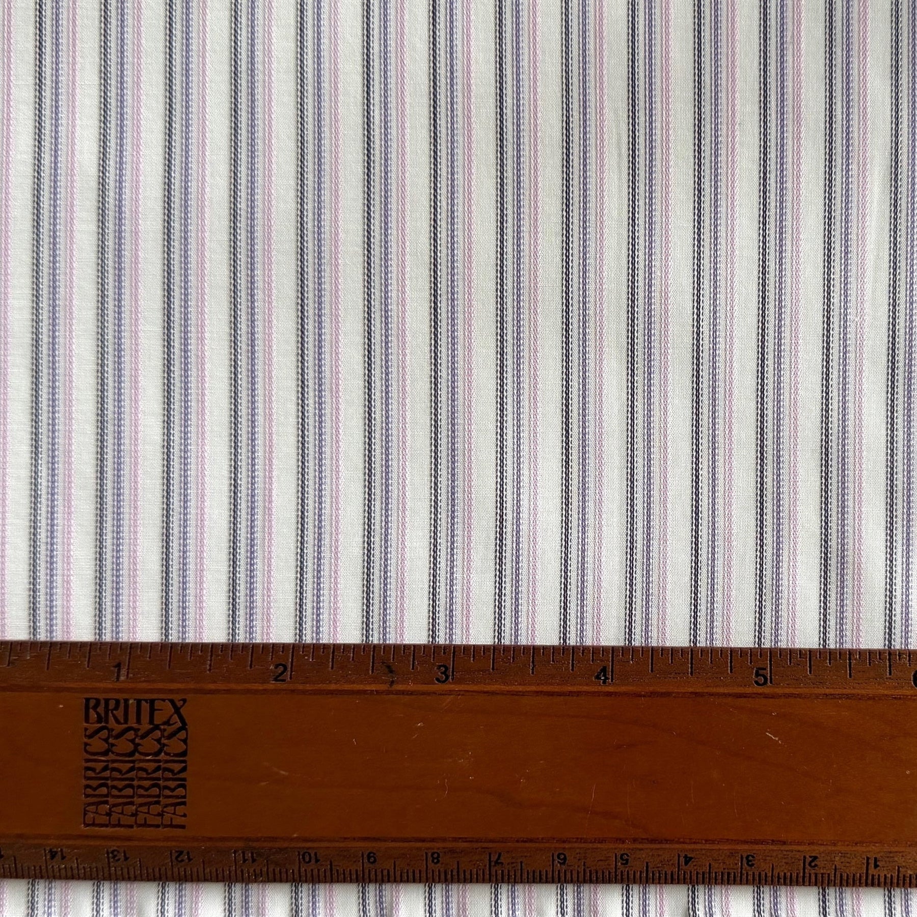 A lighter-weight pima cotton shirting with lengthwise finely stitched stripes in three shades of purple on a white background - this jaunty cotton shirting is perfect for a blouse, nightwear, or a shirt. Made in Japan. 100% cotton. 59" wide.