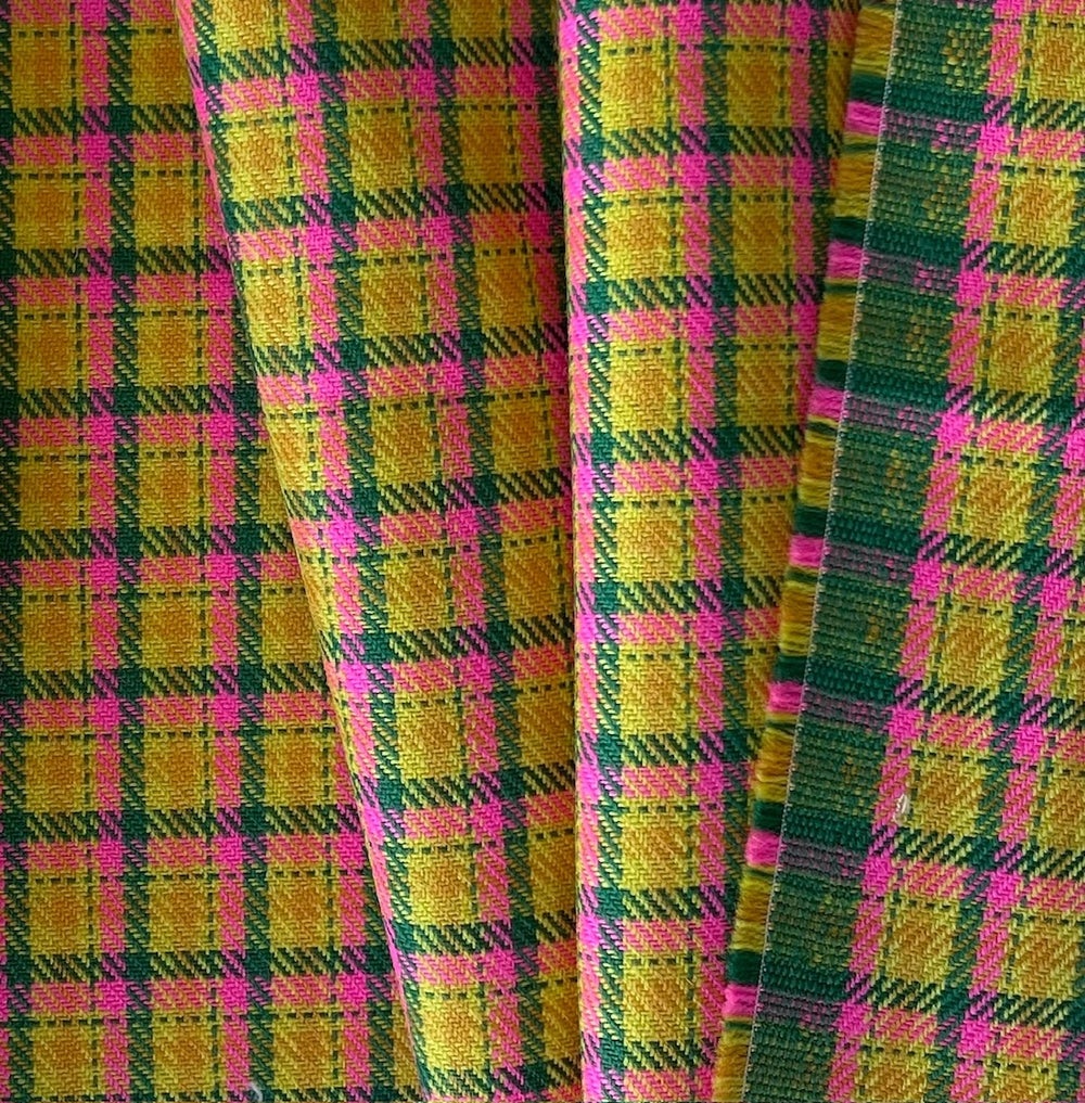 A designer virgin wool plaid in daffodil yellow with neon pink and seaweed green accents - this slightly stiffer, effervescent woolen is perfect for tailored garments, overalls, jumpsuits, and jackets. Made in Italy for a well-known Spanish designer. 100% virgin wool. 59" wide.