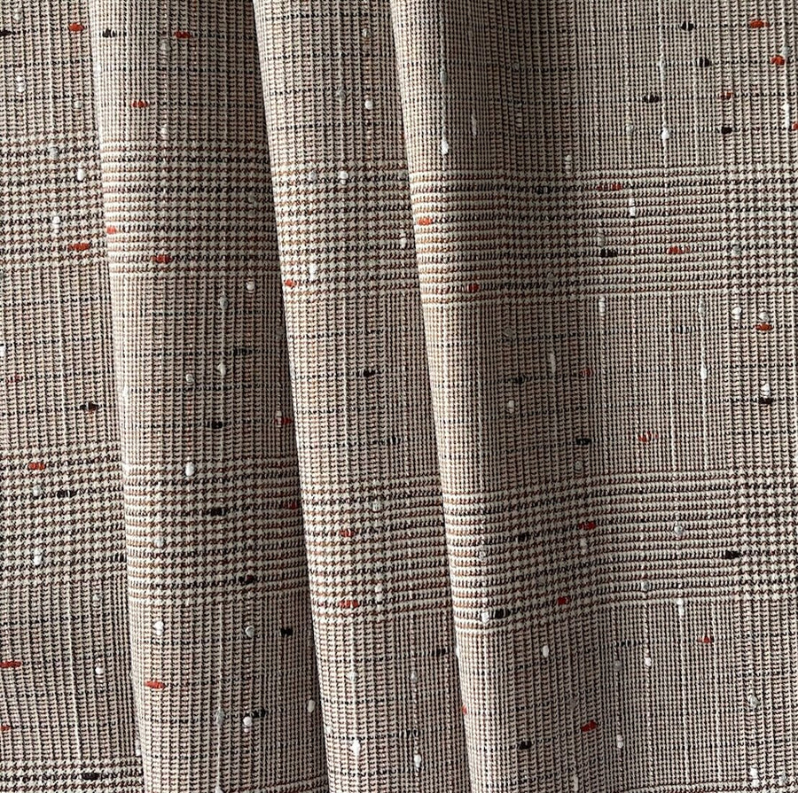 A lighter weight wool tweed in a shades of caramel Prince of Wales plaid with rust, white, and black flecks  - this tightly-woven, drapey woolen is perfect for dresses, skirts, or light-weight board shirts. Made in Italy and used by Hugo Boss. 100% wool. 62" wide.
