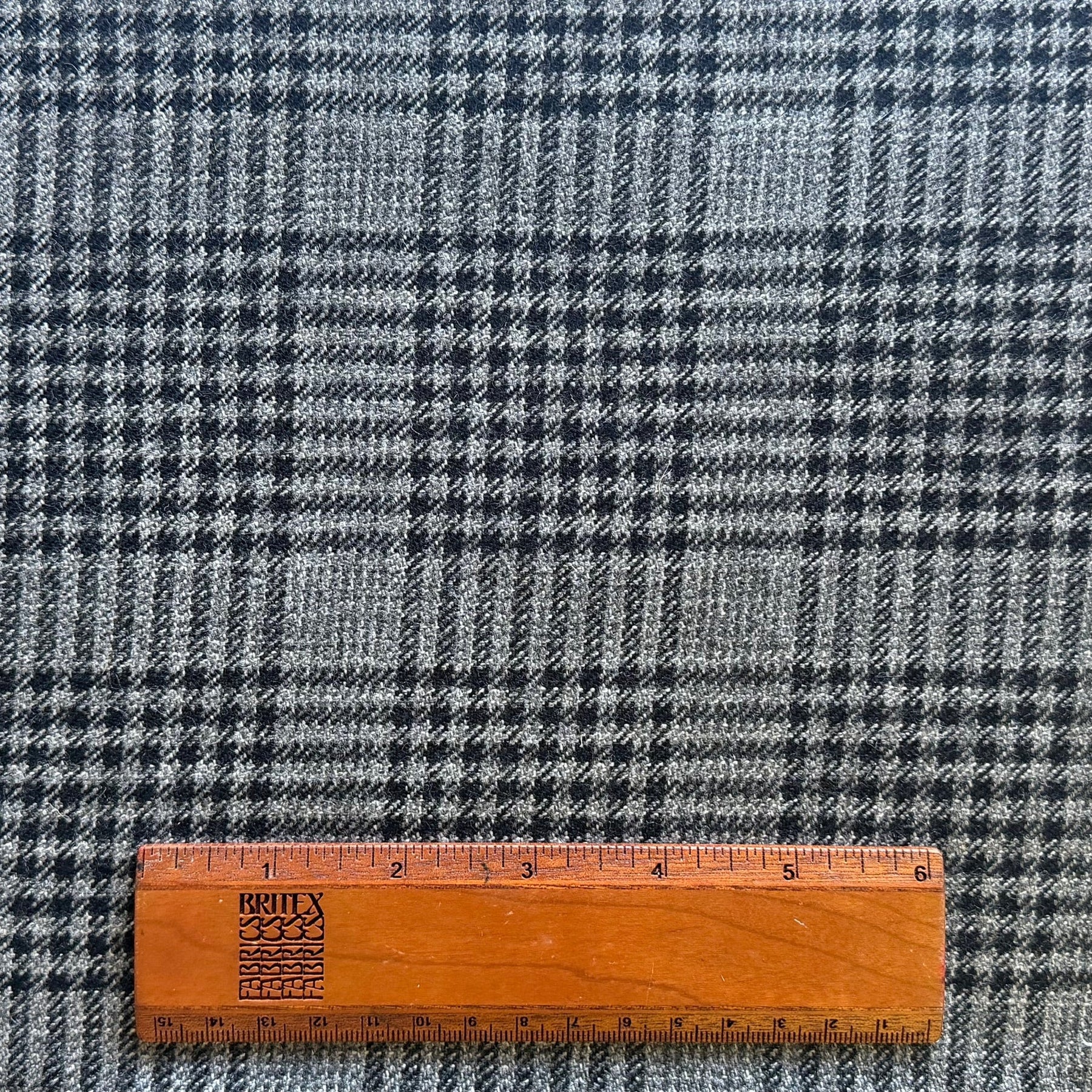 A handsome virgin wool in a Spanish grey and jet black large-scale Prince of Wales plaid - this buttery soft woolen is perfect for travel-wear, pants, or a jacket. Made in Italy. 100% virgin wool. 61" wide.