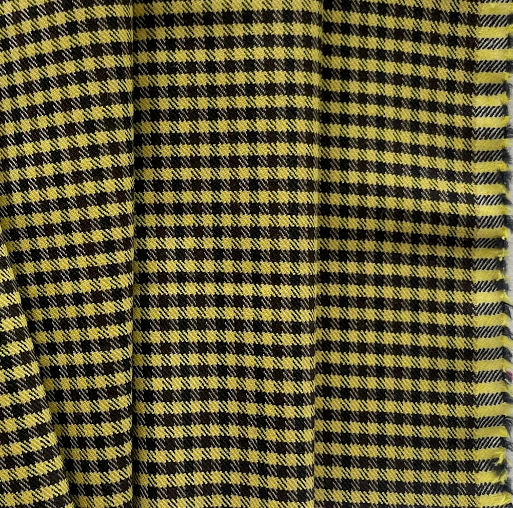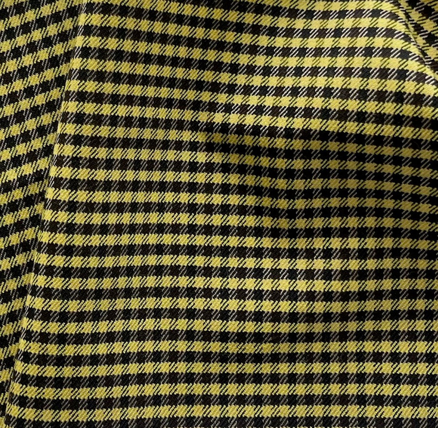 A lovely stretch wool twill check in sweet shades of bumblebee yellow and black - this tightly woven woolen is perfect for travel-wear, pants, dresses, or a jacket. Made in Italy. 98% wool and 2% lycra. 59" wide.