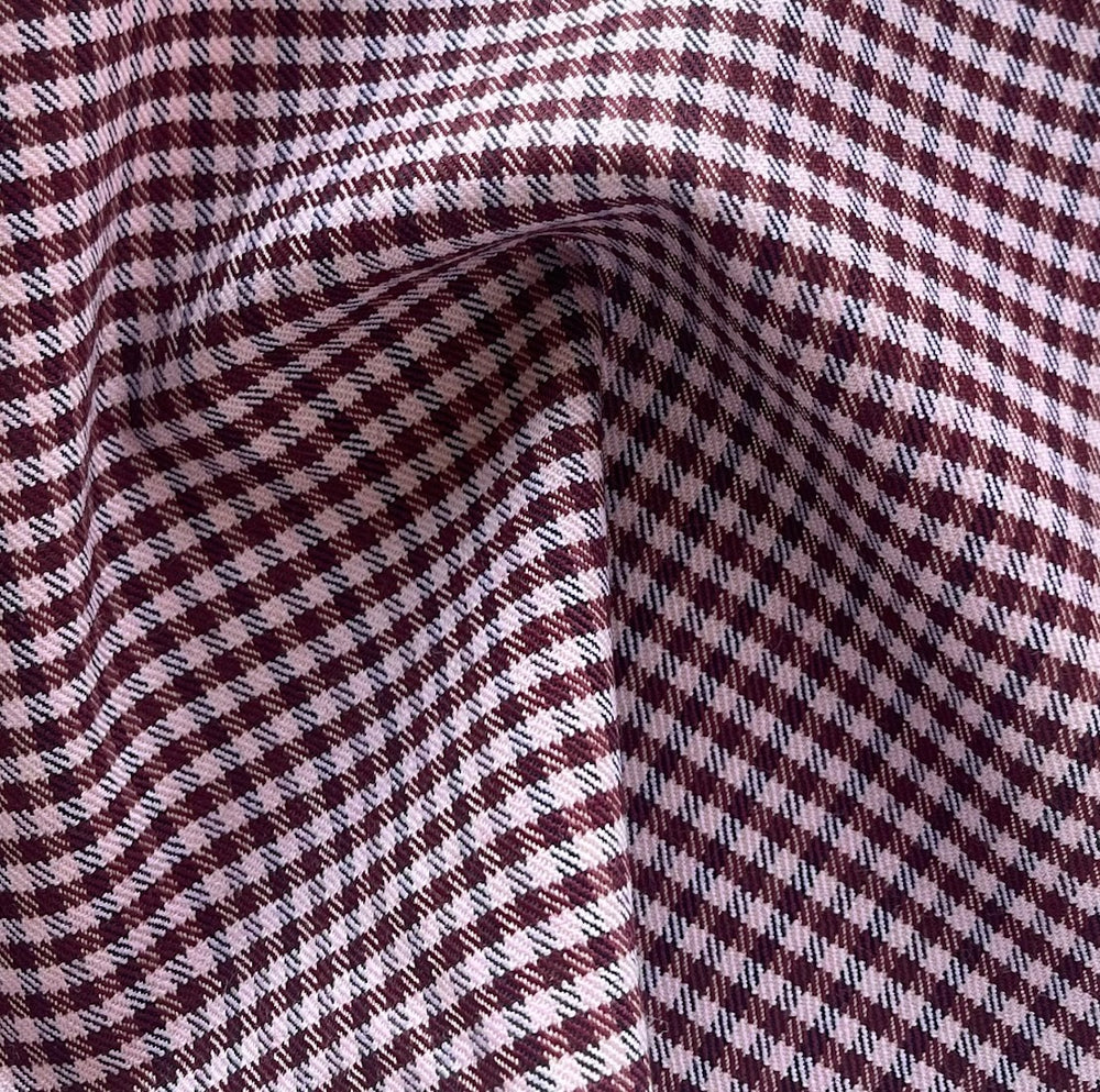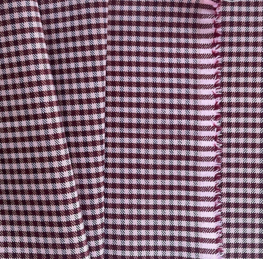 A lovely stretch wool twill check in modern shades of crepe pink, sangria, and navy - this tightly woven woolen is perfect for travel-wear, pants, dresses, or a jacket. Made in Italy. 98% wool and 2% lycra. 60" wide.