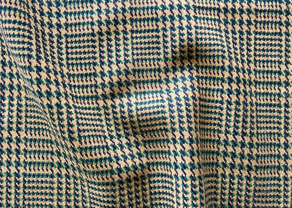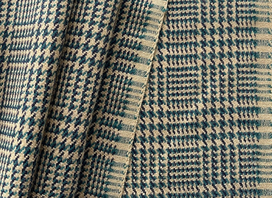 A handsome wool Glen Urquhart plaid in shades of teal green and camel - this soft, tightly-woven woolen is perfect to be paired with camel for a sporty jacket, slacks,or a skirt. Made in Italy. 100% wool. 58" wide.