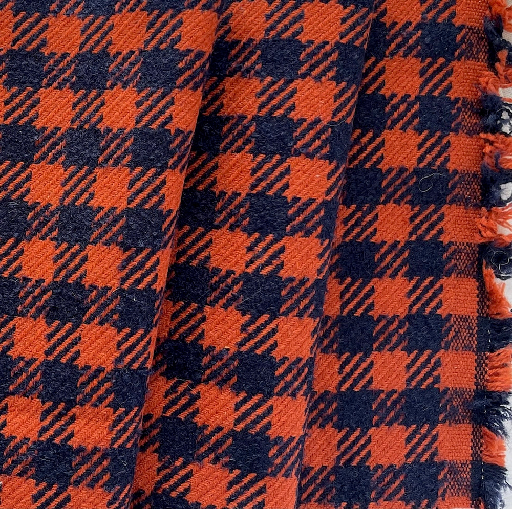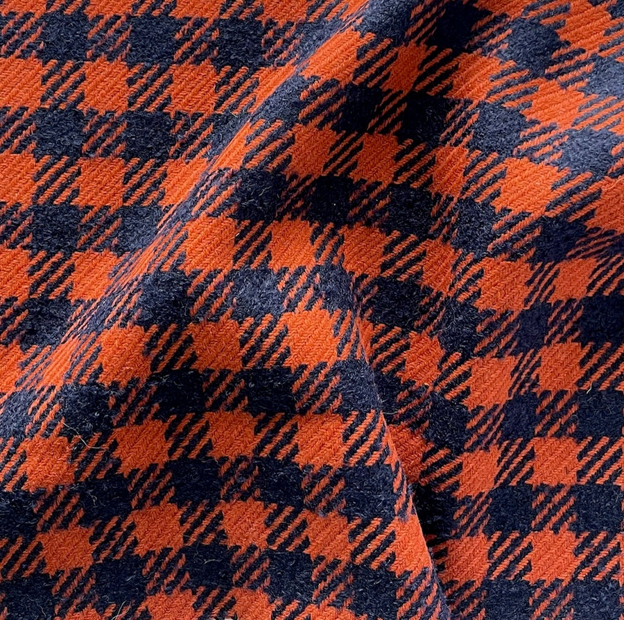 A mid-weight, handsome wool blend buffalo check in midnight navy blue and marmalade - this check is perfect for a jacket, a vest, a jumper, a board shirt, or a striking coat. 65% wool, 30% acrylic, and 5% polyester. 60" wide.