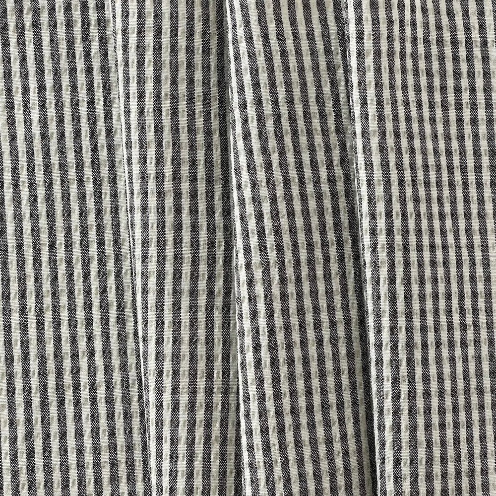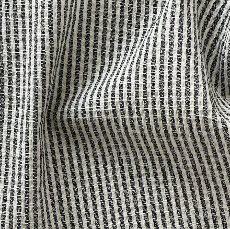 A light-weight wool and cotton seersucker in soft black and natural - with a hint of lycra, this fabulous seersucker is perfect for a dress, culottes, or even an asymmetrical skirt. Made in Italy. 60% wool, 38% cotton, and 2% lycra. 54" wide.
