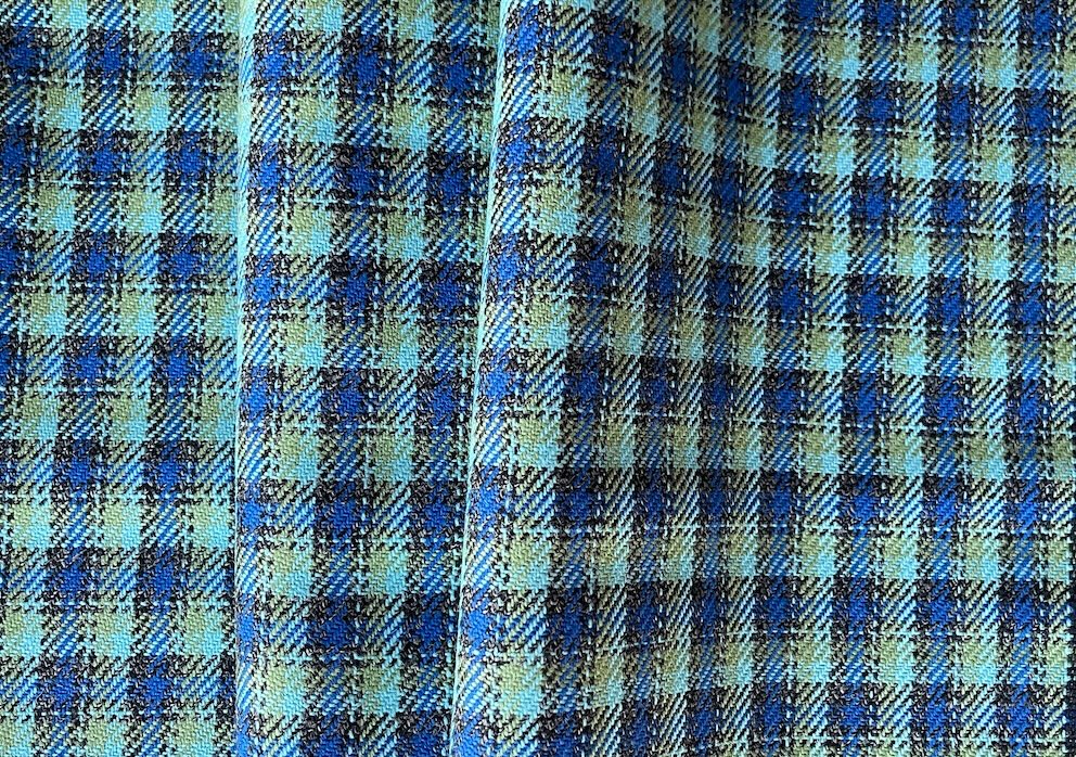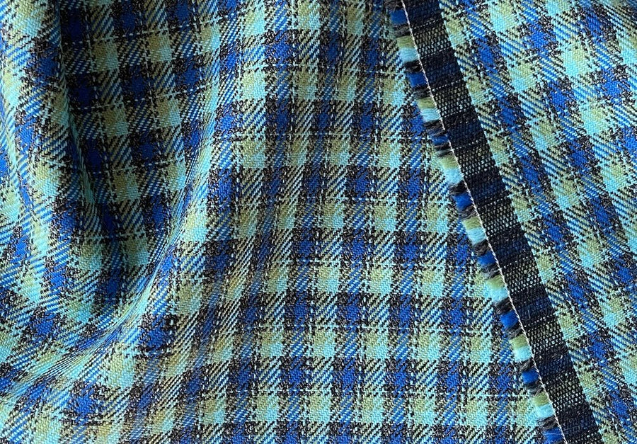 A couture mid-weight wool twill coating in a beautiful plaid in shades of aqua and royal blue, with charcoal and moss green accents - this handsome coating is great for fine tailoring and perfect for an overcoat, a suit, or a wrap coat. 100% wool. Made in Italy for Balenciaga. 59" wide.