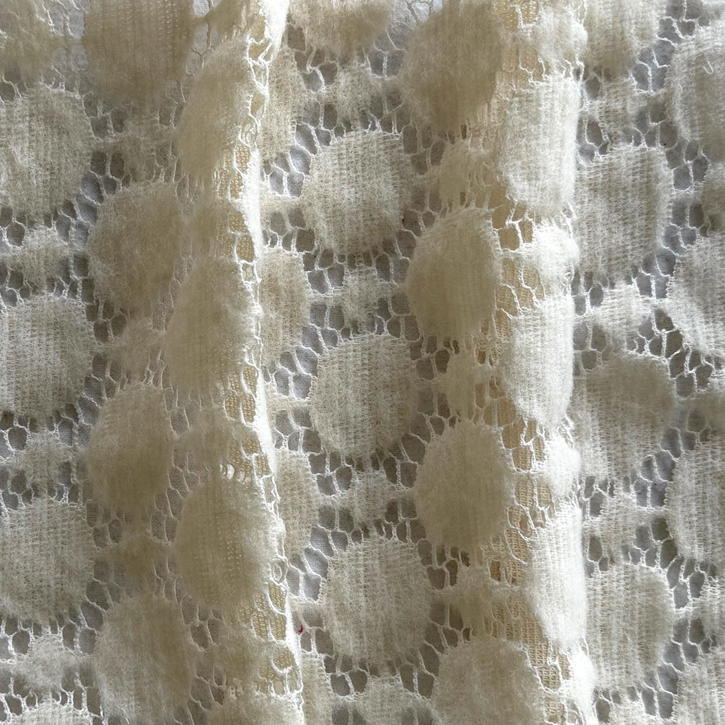A crocheted wool knit in a motif of smaller and larger dots and in a lovely shade of warm ivory - this open and airy wool is excellent for a camp shirt, polo top, a cardigan, or a bed throw. 100% wool. 45" wide.