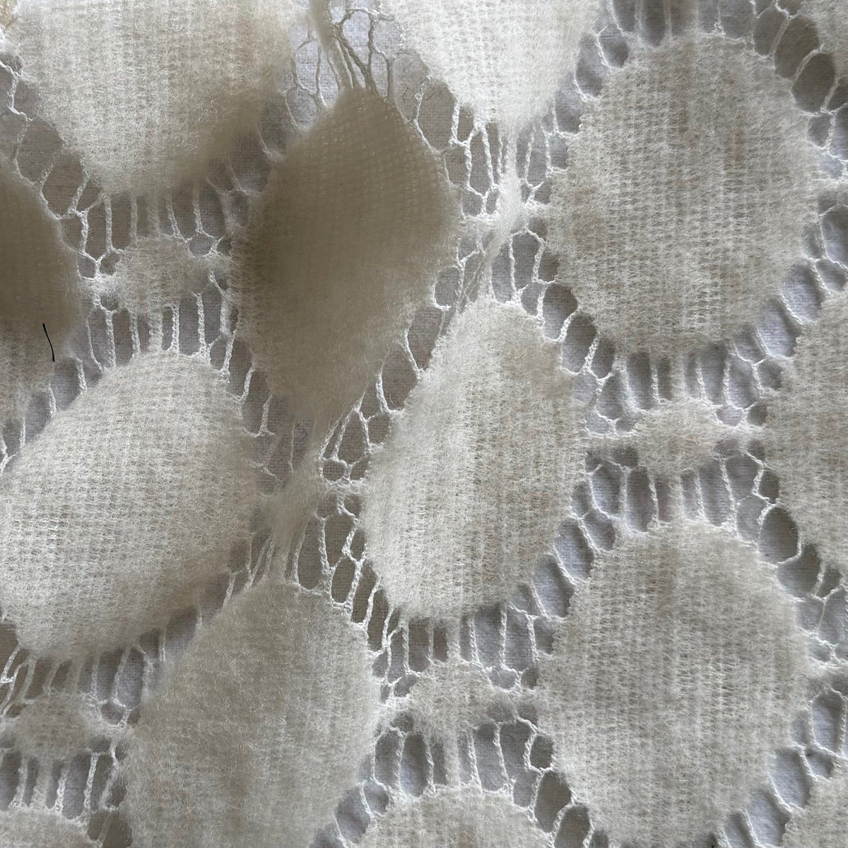 A crocheted wool knit in a larger-scale motif of smaller and larger dots and in a lovely shade of warm ivory - this open and airy wool is excellent for a camp shirt, polo top, a cardigan, or a bed throw. 100% wool. 48" wide.