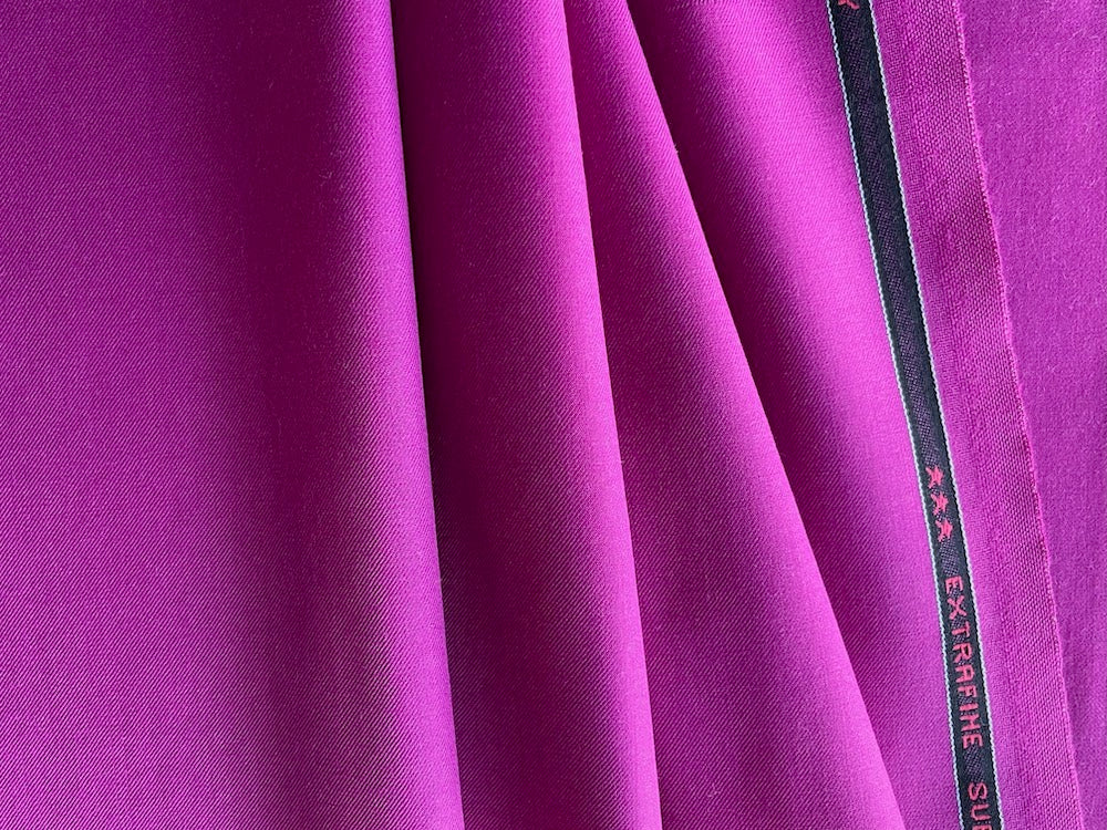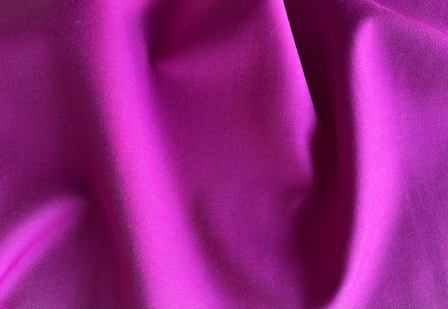 Our finest, selvedged 150s wool twill suiting in a gorgeous shade of bright saturated fuchsia - this smooth, light-weight, high-end wool suiting is perfect for classic tailoring, slacks, or a stand-out suit. Made in Italy. 100% wool. 60" wide.