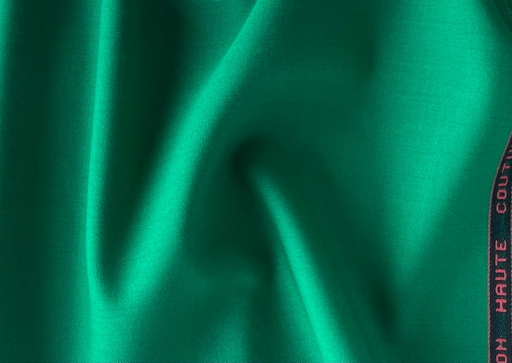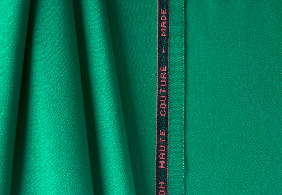 Our favorite mid-weight selvedged stretch wool twill in brilliant emerald green - with a touch of lycra, this haute couture woolen can be used either on the smooth side or the twill side, and is perfect for travel garments, tunics, culottes, and slacks. Made in Italy. 96% wool and 4% lycra blend. 58" wide.