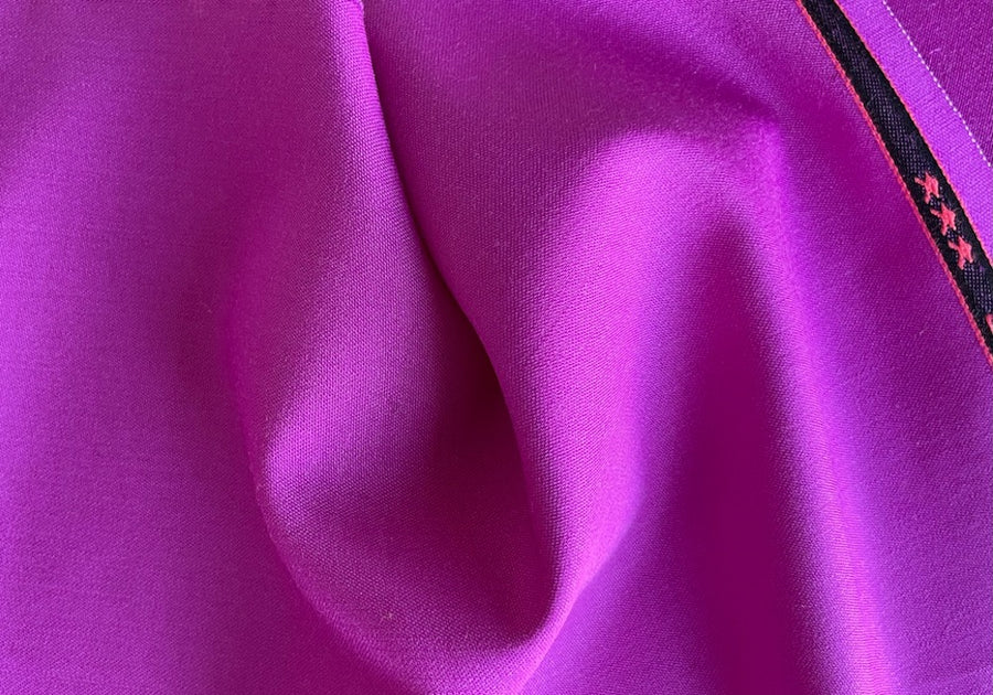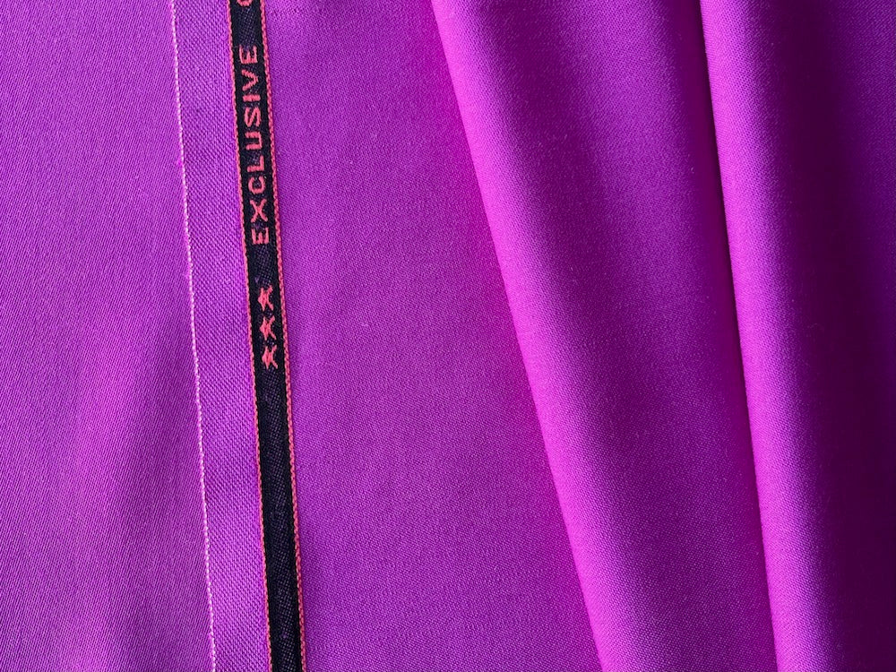 Our favorite mid-weight selvedged stretch wool twill in deep saturated orchid - with a touch of lycra, this haute couture woolen can be used either on the smooth side or the twill side, and is perfect for travel garments, tunics, culottes, and slacks. Made in Italy. 96% wool and 4% lycra blend. 58" wide.