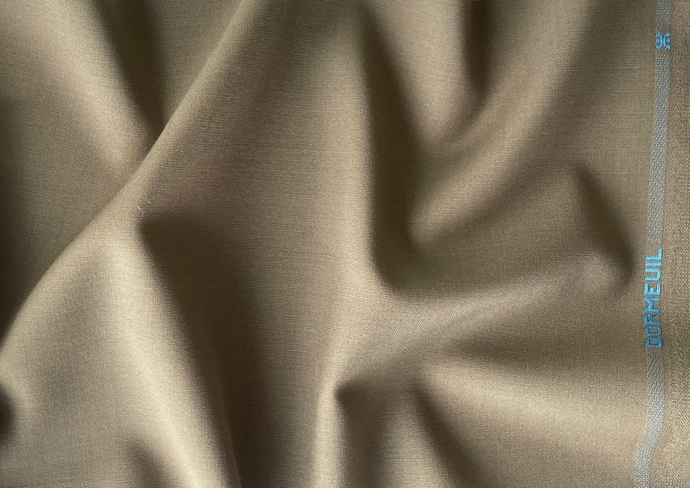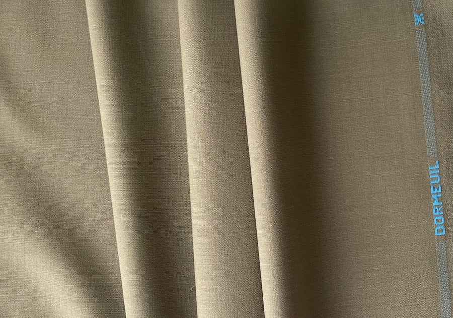 A lighter-weight, selvedged Super 90s wool suiting in deep khaki. Pliable and drapey, this wrinkle-resistant, fine English wool is perfect for travel, slacks or an outstanding suit. Made in England by Dormeuil. 100% wool. 60" wide.