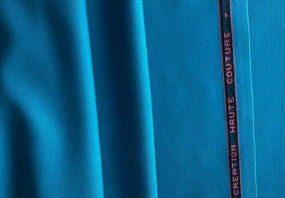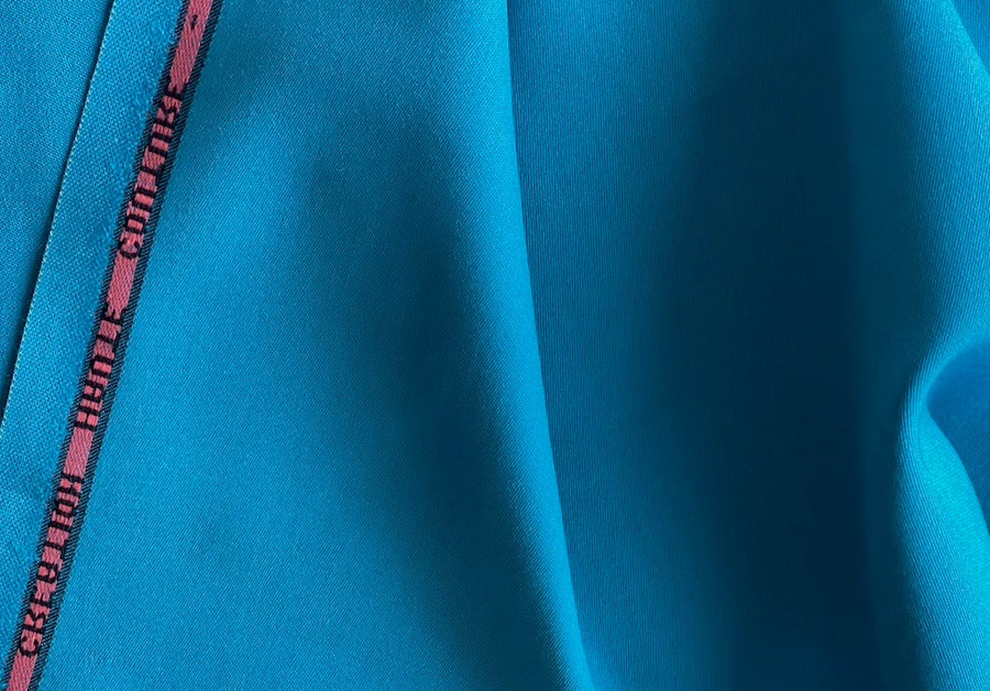 Our favorite mid-weight selvedged stretch wool twill in cool cerulean blue - with a touch of lycra, this haute couture woolen can be used either on the smooth side or the twill side, and is perfect for travel garments, tunics, culottes, and slacks. Made in Italy. 96% wool and 4% lycra blend. 58" wide.