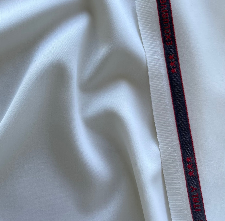 A unique, high-end wool faille suiting in bright dyed white - this smooth, light to mid-weight wool suiting is buttery soft and perfect for travel garments, classic tailoring, slacks, or a stand-out suit. Made in Italy . 100% wool. 58" wide.