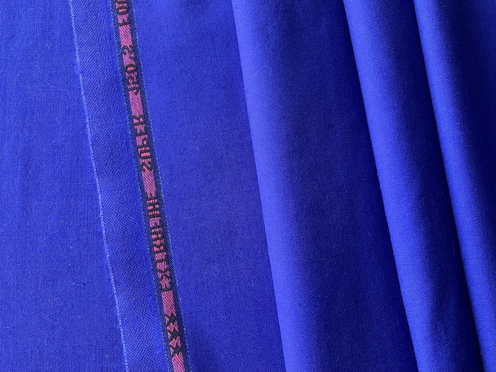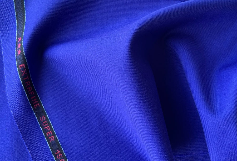 Our finest, selvedged 150s wool twill suiting in a gorgeous shade of vivid lapis lazuli - this smooth, light-weight, high-end wool suiting is tightly-woven and perfect for classic tailoring, slacks, or a stand-out suit. Made in Italy. 100% wool. 60" wide.