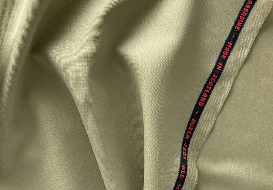 A lighter-weight selvedged super 120s wool twill suiting in classic khaki - this elegant, smooth, high-end wool suiting is perfect for travel garments, classic tailoring, slacks, or a suit. Made in Scotland. 100% wool. 59" wide.