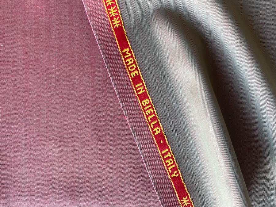 A lighter-weight, selvedged super 160s wool suiting in a sage green and brick red cross-weave herringbone - this smooth, tightly-woven wool suiting is perfect for jackets, pants, suits, sor kirts. Made in Italy. 100% wool. 59" wide.