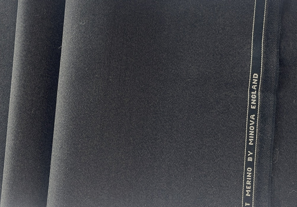 A handsome selvedged merino wool suiting in black coffee brown. Pliable and drapey, this fine English woolen is perfect for slacks or an outstanding suit. Made in England. 100% wool. 62" wide.