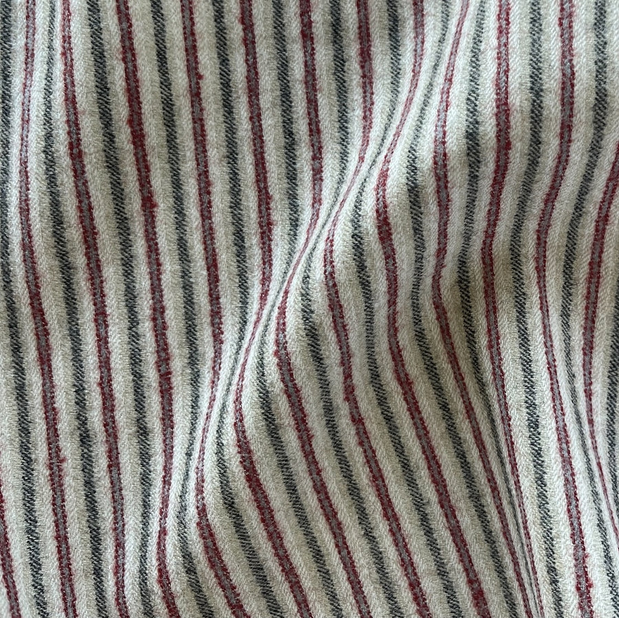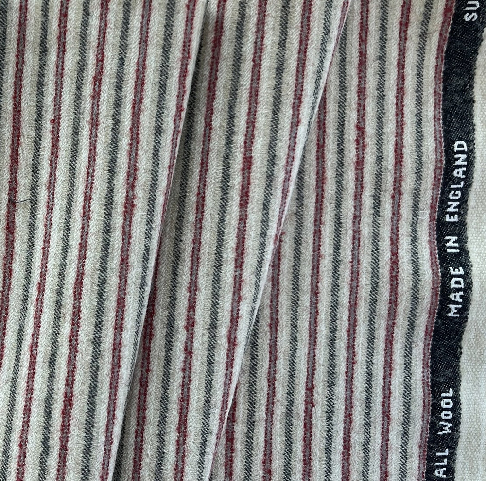 A selvedged wool suiting in cranberry and soft black stripes on a buffed beige background - this soft suiting is perfect for jackets, cozy robes, pants, or vests. Made in England. 100% wool. 57" wide.