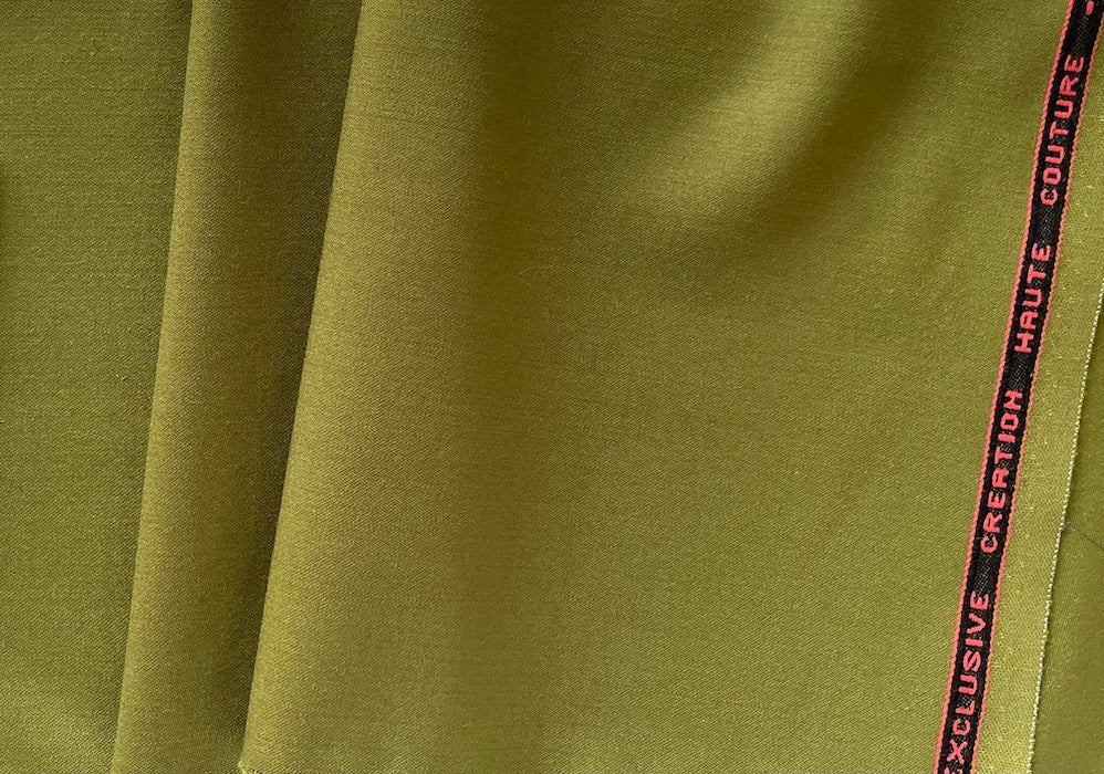 A fine selvedged stretch wool twill suiting in rich olive green - with a hint of lycra, this smooth, high-end wool suiting is perfect for travel garments, classic tailoring, slacks, or a suit. Made in Italy. 97% wool and 3% lycra. 59" wide.