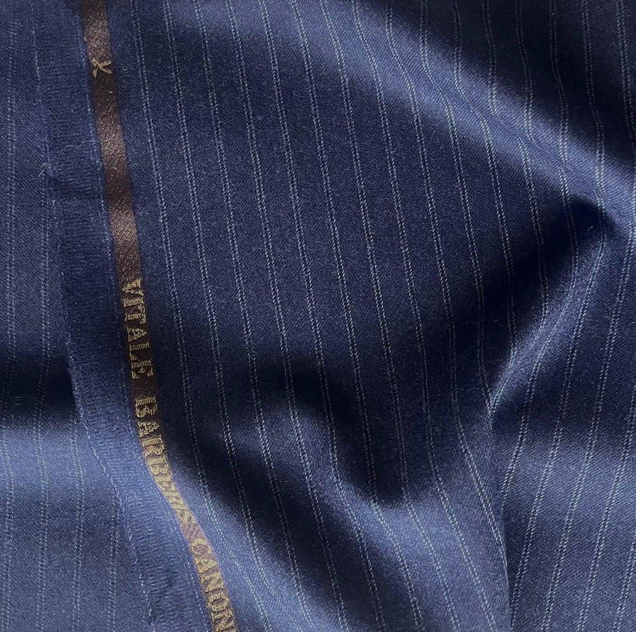 A fine lighter-weight wool flannel in classic navy blue with double chalk pinstripes - pliable and soft, this flannel is perfect for summer suiting, flat-front slacks, or a dress. Made in Italy by Vitale Barberia Cononico, milling fine fabric since 1663. 100% wool. 62" wide.