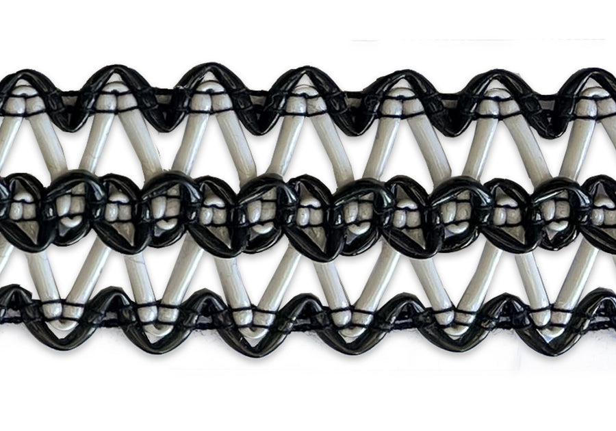 1 1/4" wide trim in fashionable black and white leatherette with a stark zig-zag design. This trim is perfect for sewing haute couture garments such as French designer-inspired jackets - layer your trims for a unique and special look! Made in USA.