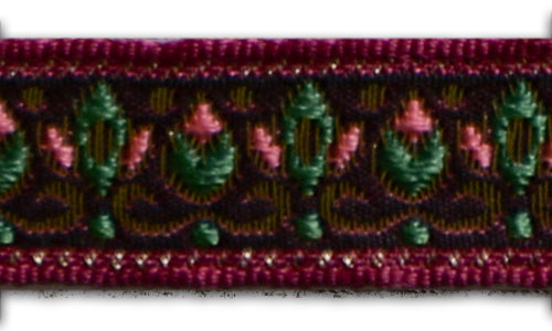 1/2" wide woven ribbon with an Art Nouveau-inspired design of French pink tulips framed in gold metallic swirls on a black background, and with narrow burgundy borders. Made in France.