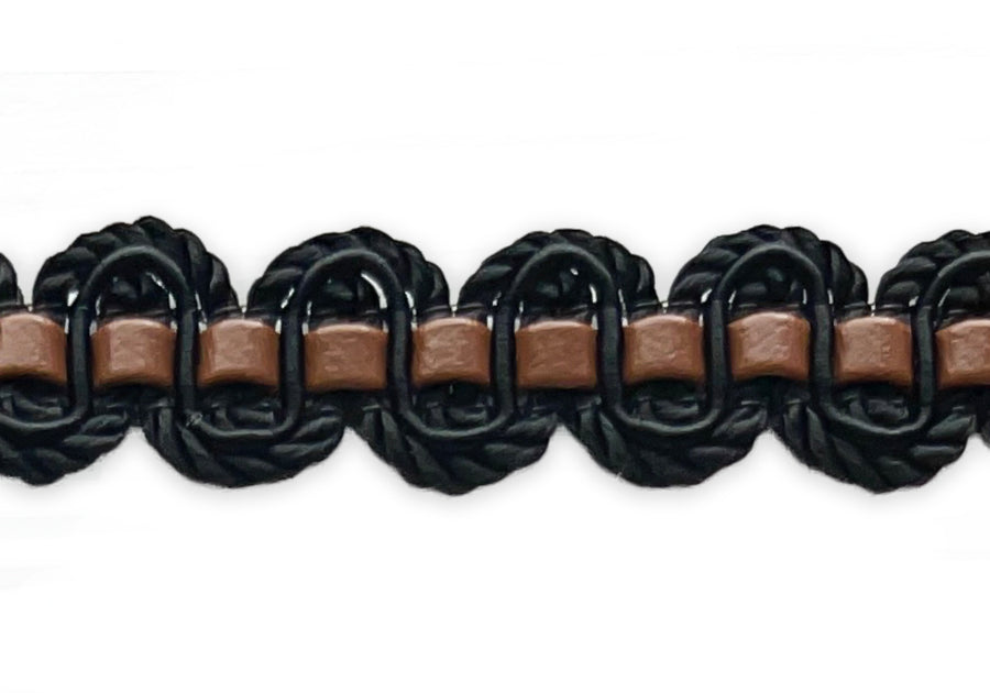 1/2" wide braided trim in black waves threaded with a narrow brown leather ribbon. This trim is perfect for sewing haute couture garments such as French designer-inspired jackets - layer your trims for a unique and special look! Made in USA.