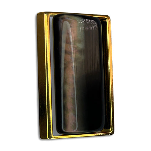 A rectangular 1 3/4" plastic button in milk chocolate brown with a gold metallic rim. Shank backing. Made in Switzerland.