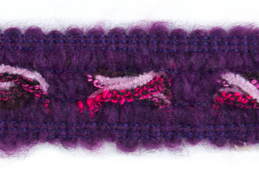 1" wide braided trim in purple plum, with accents in shades of pink. This trim is perfect for sewing haute couture garments such as French designer-inspired jackets - layer your trims for a unique and special look! (Made in France) Wool blend.